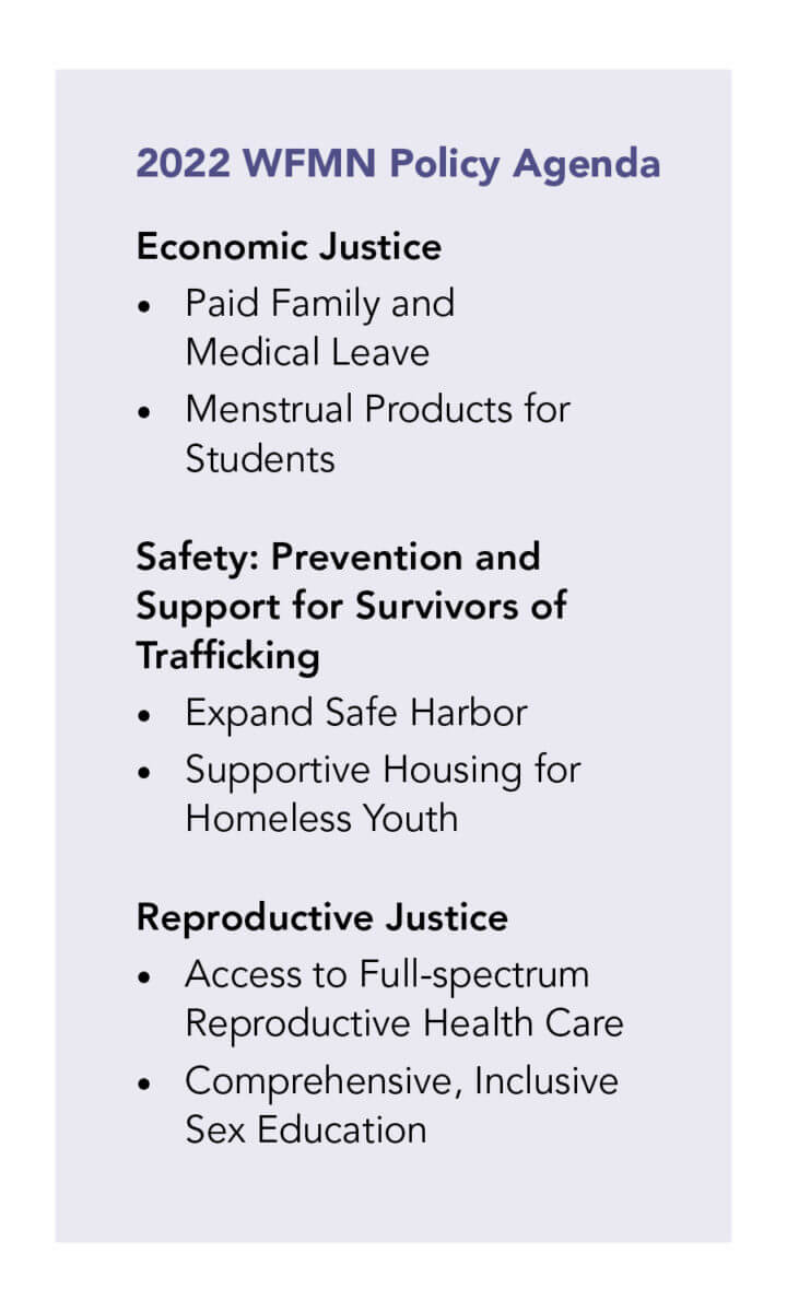 Policy change is central to transforming our inequitable systems, and so in addition to grantmaking and funding research, the Women’s Foundation of Minnesota drives a policy agenda each year that centers women, girls, and gender-expansive people, including Black, Indigenous, and women of color, LGBTQ+ people, women and girls from Greater Minnesota, and women and girls with disabilities in the fight for safety, economic justice, and holistic well-being. For the second year, advocacy for issues central to safety and economic justice is happening entirely virtually and in partnership with a powerful cross-sector leadership of elected officials, grantee-partners, young women, and testifiers who have directly experienced the systemic issues we need to change so all women and girls thrive.