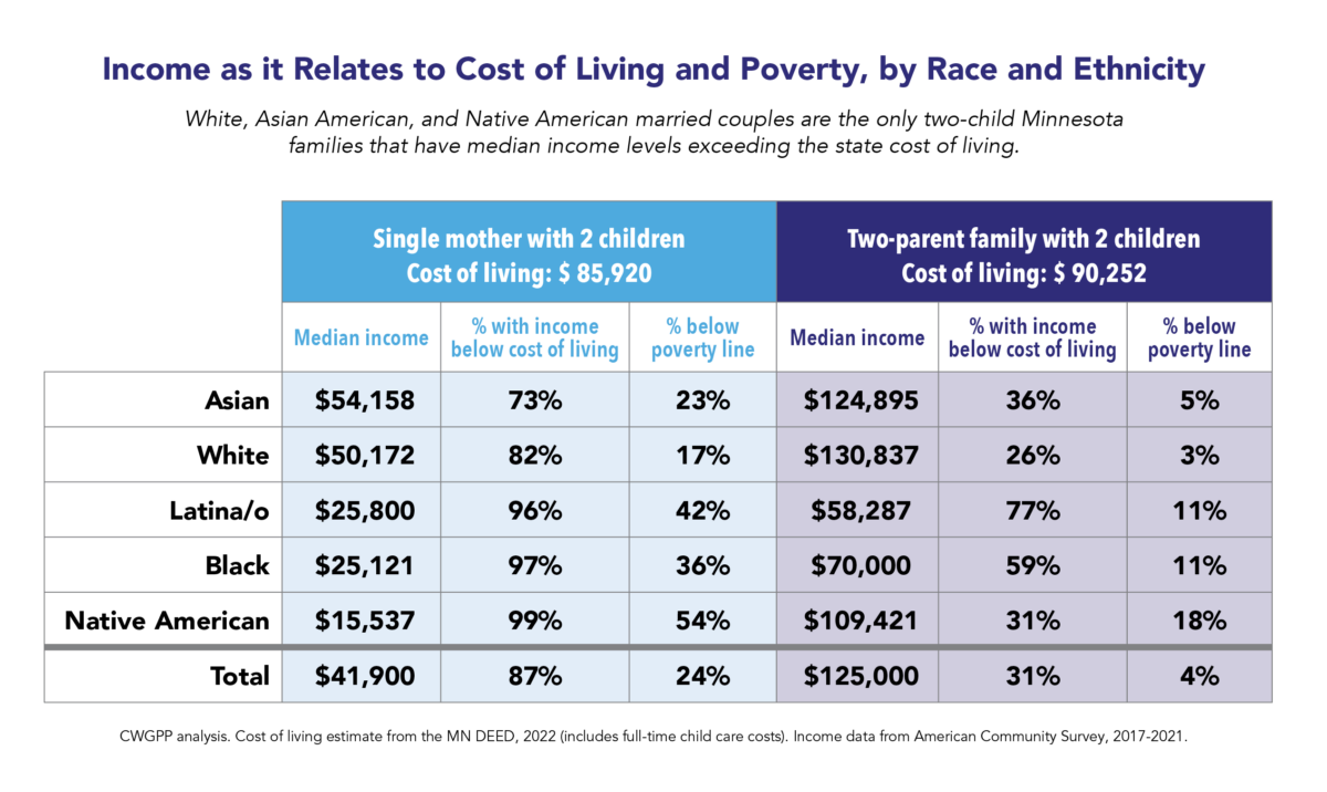 A significant portion of Minnesota mothers earn the most in their household. The overall poverty rate in Minnesota is lower than the national average, however single mothers’ income levels across racial and ethnic groups, and rural and urban areas, fall far short of the cost of living.