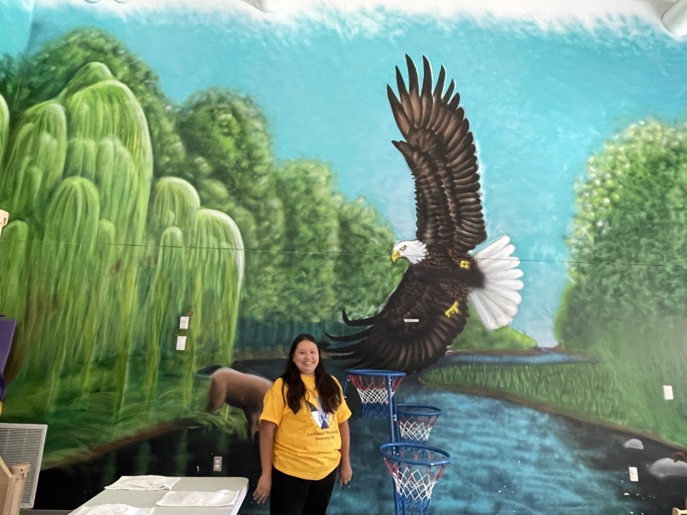 Next, we met with Vanessa Goodthunder, a former Young Women’s Cabinet member, Innovator, and member of the Women’s Foundation board, in her Morton Lower Sioux Community. She gave us a warm welcome and a tour of C̣aƞṡayapi Waḳaƞyeża Owayawa Oṭi or Lower Sioux Early Head Start and Head Start center. Here, we learned that the center aims to prepare children for school while providing them with good health habits. One of the main goals of this center is to preserve Dakota language and raise the next generation of Dakota language speakers. Coming from an Indigenous family who also speaks a native dialect, I can see how language preservation is very important. The center says that “Dakota Iapi kiƞhaƞ sdodkiyapi kte,” when they speak the Dakota language, then they will know who they are. I have learned to value this commitment to preserving and growing Indigenous language among all generations. Vanessa is doing a fantastic job as a leader in her community, and I am so glad I could meet her in person.