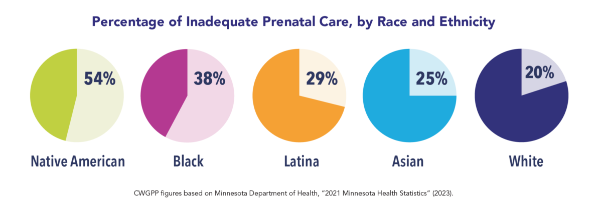 Access to prenatal care is unequal across race and ethnic groups in Minnesota. Eighty percent (80%) of women in Minnesota in 2021 received prenatal care in the first trimester of their pregnancy. However, that access diverges sharply across racial groups. White women report the highest rates of care beginning in the first trimester (84%) while Native American women report the lowest rates (55%).32