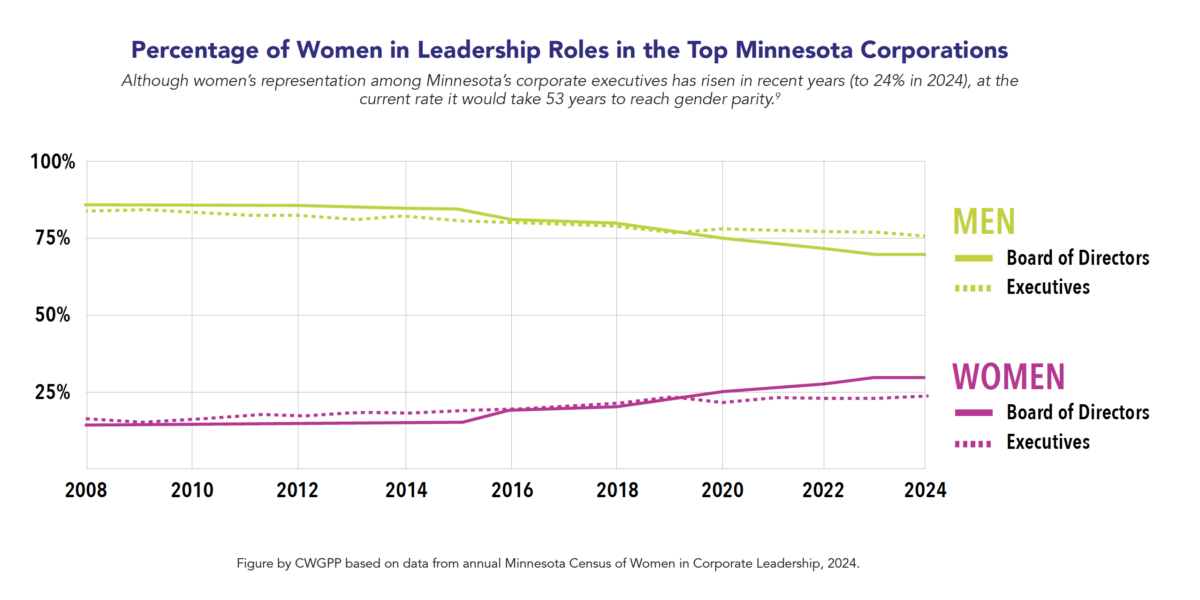 Although women’s representation among Minnesota’s corporate executives has risen in recent years (to 24% in 2024), at the current rate it would take 53 years to reach gender parity.56